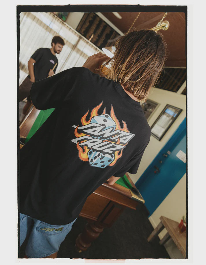 Rock a bold statement with this Santa Cruz tee featuring eye-catching flaming dice graphics. The classic black base lets the vibrant design take centre stage, perfect for skaters and streetwear enthusiasts who aren't afraid to stand out. Comfortable everyday wear that brings serious style credentials to your wardrobe.