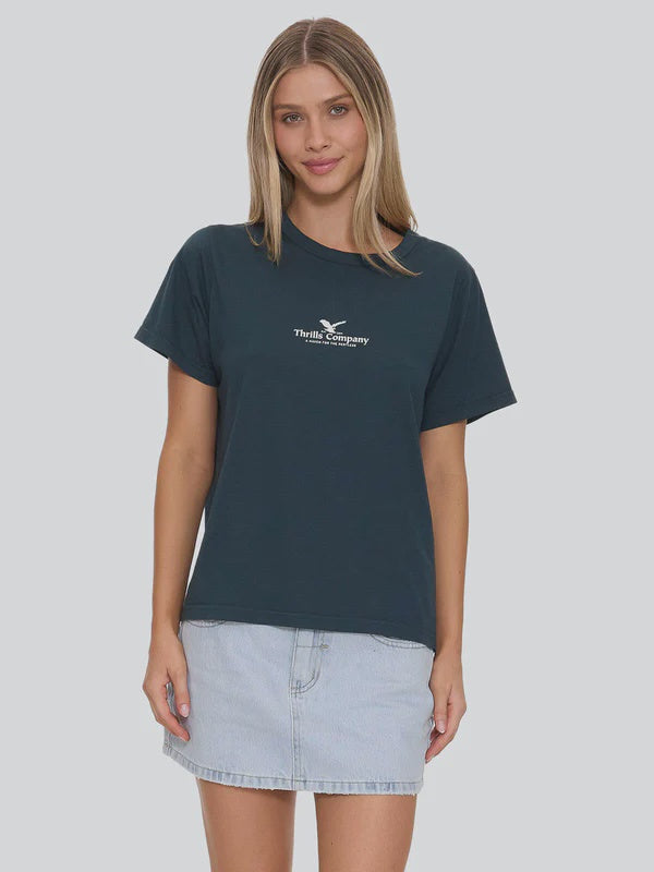 The Haven For The Reckless Relaxed Tee in Jasper Green keeps things laid-back with a soft hand feel and clean lines, then sharpens up with a slim, relaxed silhouette. Cut from lightweight cotton jersey with a ribbed crewneck, it's breezy on hot days and perfect for layering when the temps dip. A crisp front chest print adds the Thrills hit of attitude, while the rich colourway keeps it understated and versatile. Pair this women's tee with baggy denim, mini skirts, or low-rise cargos for an effortless street look.