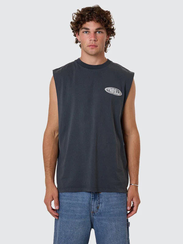 Cut wide and sleeveless with a street edge finish, the Shadowless Merch Fit Muscle Tee in Ebony channels that no-fuss, gritty energy. Made from midweight organic cotton t-shirt jersey, it features signature Thrills prints, a nod to old-school rebellion. Part of our Thrills tee Australia spring line-up, this relaxed-fit tee is a staple for warmer days, pairing effortlessly with men's baggy jeans, cargo shorts, or layered under open button shirts.