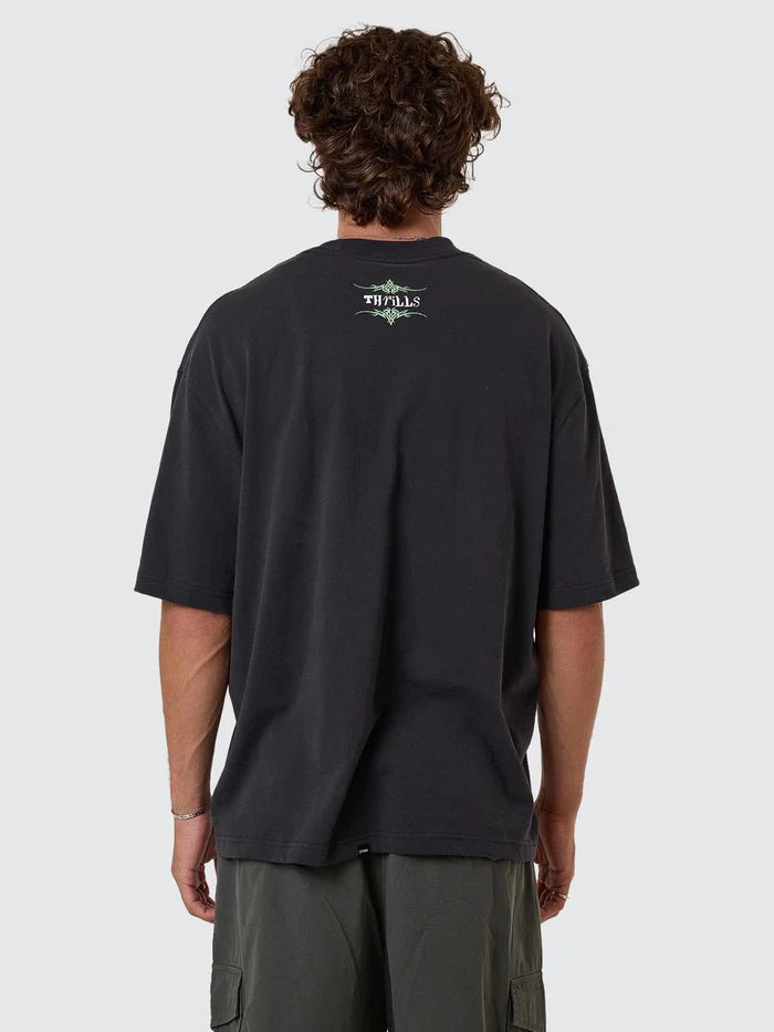A designer's pick from our Thrills tee Australia spring drop, the Transmission Box Fit Oversize Cropped Tee in Washed Black brings controlled chaos to your black oversized tee rotation. Loaded with random, multi-placement graphics, this vintage graphic tee is an all-around hit. Made from heavyweight cotton jersey, it features a roomy, boxy silhouette with raw edge energy and a dry hand finish. Shop men's graphic tees from our men's streetwear Australia selection and elevate your street style with iconic graphics. Whether paired with baggy cargo shorts or men's denim jeans, this one can't be missed.