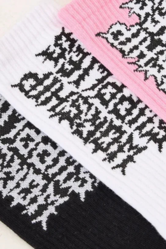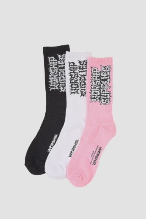 - The Pile Up 3 Pack is a set of three classic colour options including White, Flamingo, and Black. Built for all-day comfort and breathability, these crew socks are crafted from a soft, premium blend of cotton, polyester and elastane. Available in one size, they feature "Worship Supplies" logo on the leg in vibrant, eye-catching palettes.